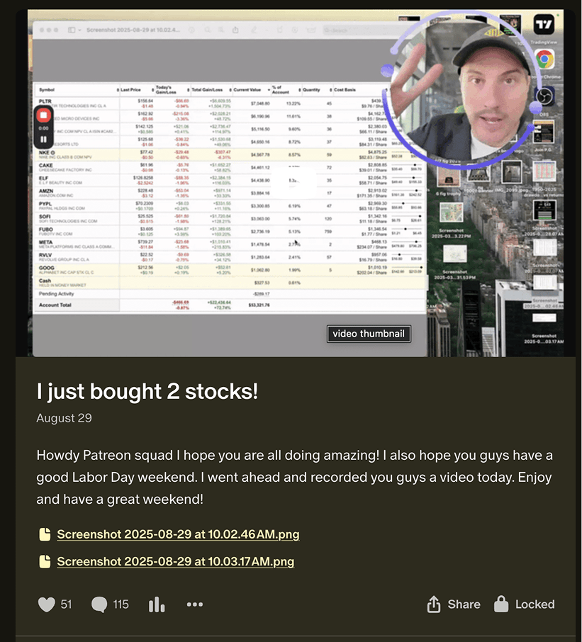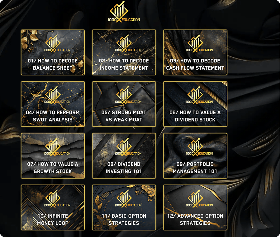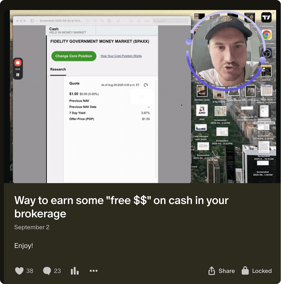 We do this through my full course curriculum, access to every move I’ve made in my public account since 2017, a private Discord with live calls, and a weekly investor report, plus much more.